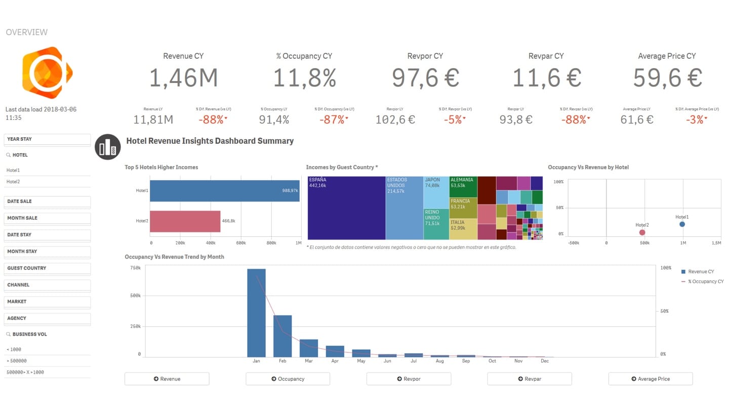 El cuadro de mando creado permite visualizar los principales KPIs del sector hotelero, la posibilidad de analizar en escenarios what-if con predicciones condicionales, analizando el impacto económico de ventas y previsiones.